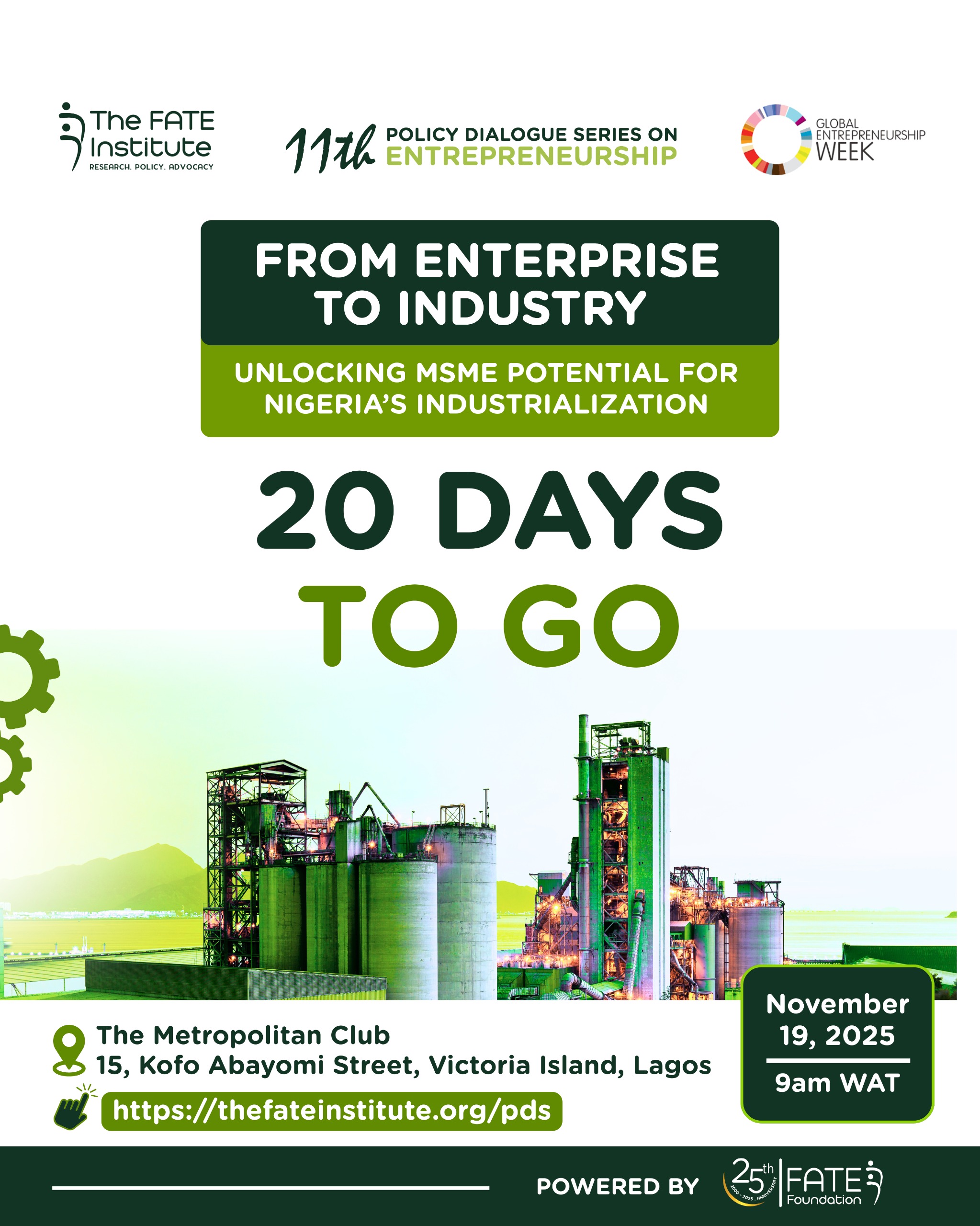 We’re thrilled to invite you to the 11th Annual FATE Institute Policy Dialogue Series on Entrepreneurship, themed “From Enterprise to Industry: Unlocking MSME Potential for Nigeria’s Industrialization.” Join top policymakers, thought leaders, and key stakeholders as we explore how MSMEs can drive Nigeria’s industrial transformation. Date: November 19, 2025Time: 9:00 AM WATVenue: The Metropolitan Club,... Read more