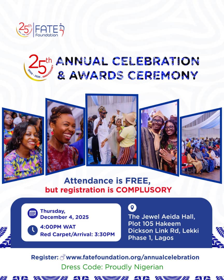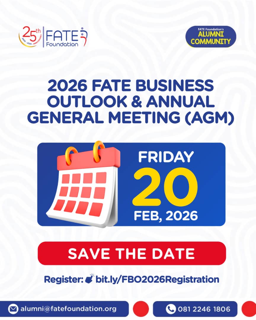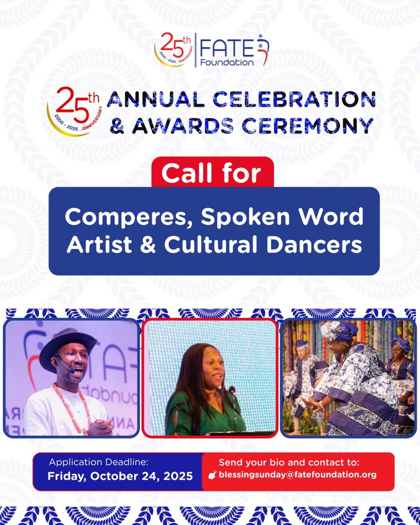 Dear FATE Foundation Alumni, We are excited to announce the CALL FOR COMPERES, SPOKEN WORD ARTISTS AND CULTURAL DANCERS, to perform at our 25th Annual Celebration and Awards Ceremony which is scheduled to be held on the 4th of December 2025 at Lekki, Lagos. So, if you are do any of the above, kindly send... Read more