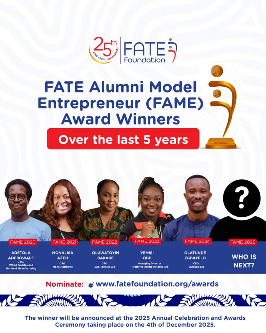 The nominations for the 2025 FATE Alumni Model Entrepreneur (FAME) Award are STILL OPEN. The FAME Award celebrates outstanding alumni of FATE Foundation who have grown and evolved over the years in their businesses and impact the society by creating source of income for people through their business. We have had 5 exceptional winners in... Read more