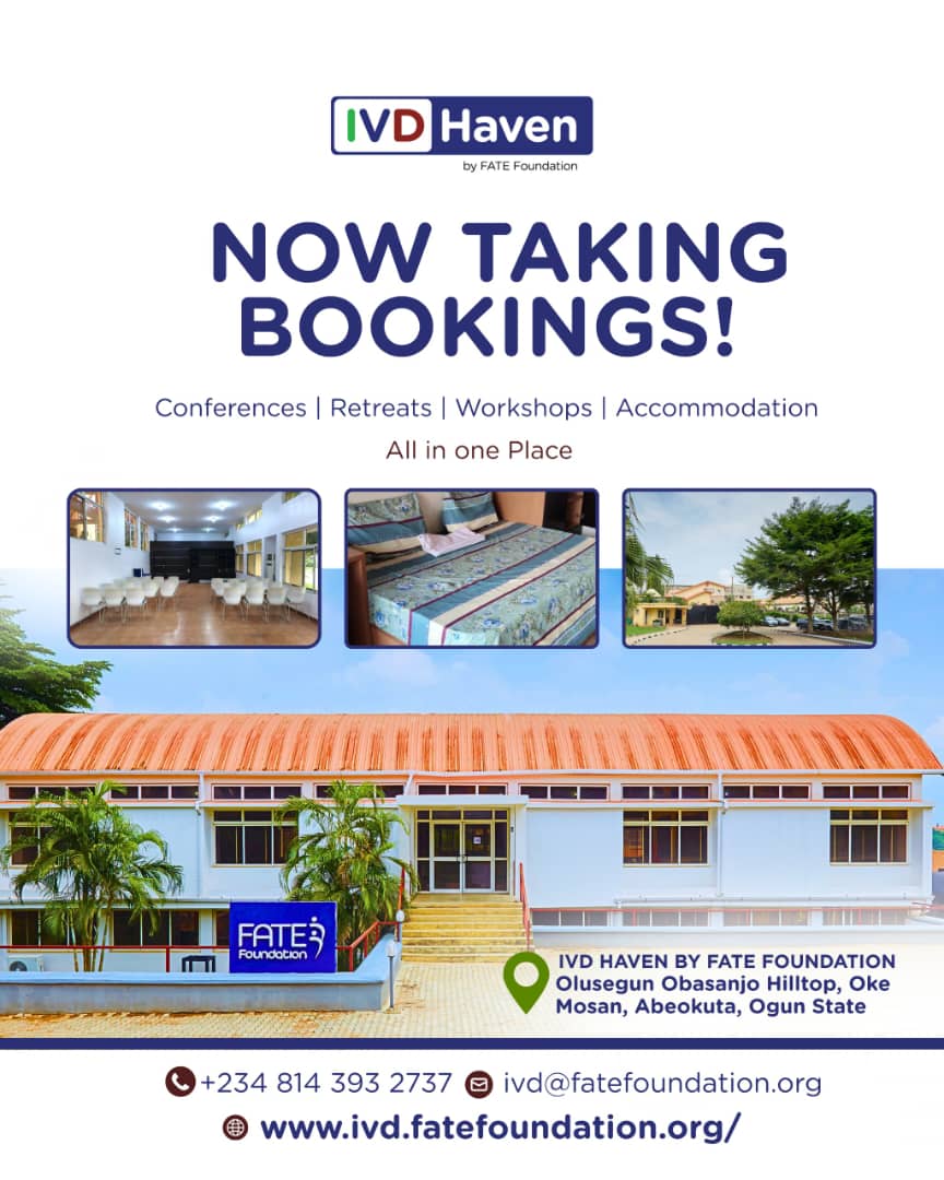 Looking for the perfect venue for your next conference, training, or retreat? We are pleased to announce that IVD Haven by FATE Foundation is now live and open for bookings. Our facility offers:✅ Fully equipped conference rooms✅ Standard training facilities✅ Comfortable accommodation Plan with ease and host with confidence. Book your space today: https://ivd.fatefoundation.org/